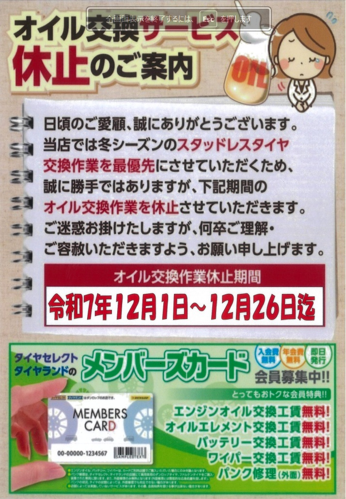 例年のご案内となりますが、今年も去年と同様に12月のオイル交換を中止させて頂きます。