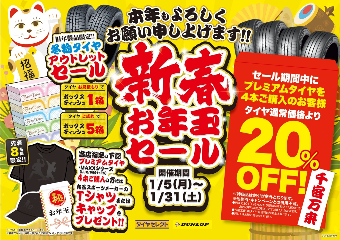 新春セール!!! いつもタイヤセレクト久が原のホームページを ご覧頂きまして誠にありがとうございます。 本日1/5より新春セールを開始致します(#^^#) お得な期間となりますので是非ご来店を お待ちしております('◇')ゞ 2026.01.05