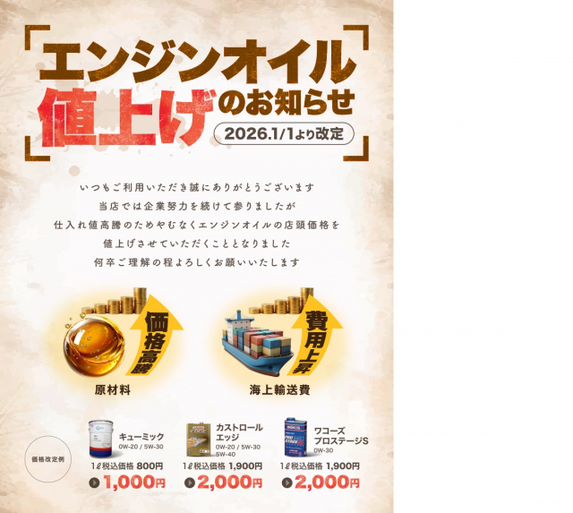 いつもタイヤセレクト久が原のホームページを ご覧頂きまして誠にありがとうございます。 タイトルにあります様に2026年1月1日より エンジンオイルの値上げを致します。 いつもご利用頂いていますお客様には 大...