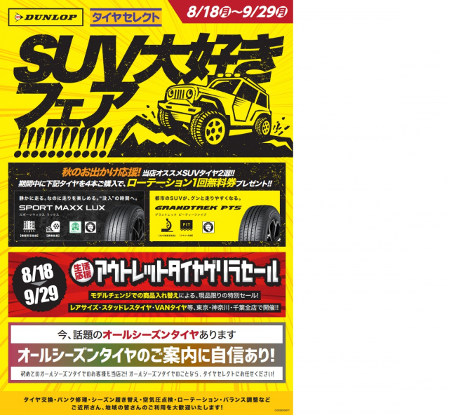 いつもタイヤセレクト久が原のホームページを ご覧頂きまして誠にありがとうございます。 8/18より夏季休暇を終わり通常営業となっております(^^♪ 8/18より【SUV大好きフェア】を実施中(*^_^*) 期間中にグ...