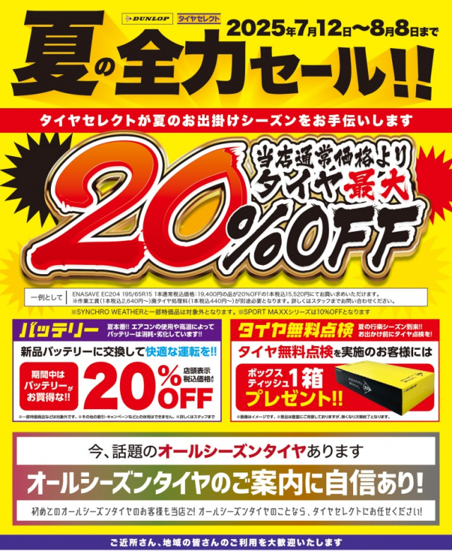 いつもタイヤセレクト久が原店のホームページを ご覧頂きまして誠にありがとうございます。 期間は7/12~8/8まで(´▽`*) (当店は定休日の関係で7/14からの開始となります) ダンロップタイヤを4本ご購...