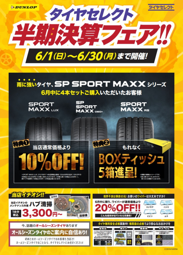 いつもタイヤセレクト久が原店のホームページを ご覧頂きまして誠にありがとうございます。 6月のキャンペーンは、、、 マックスシリーズ4本ご購入で10%OFF!!!(=゚ω゚)ノ さらにBOXティッシュ5箱をプ...