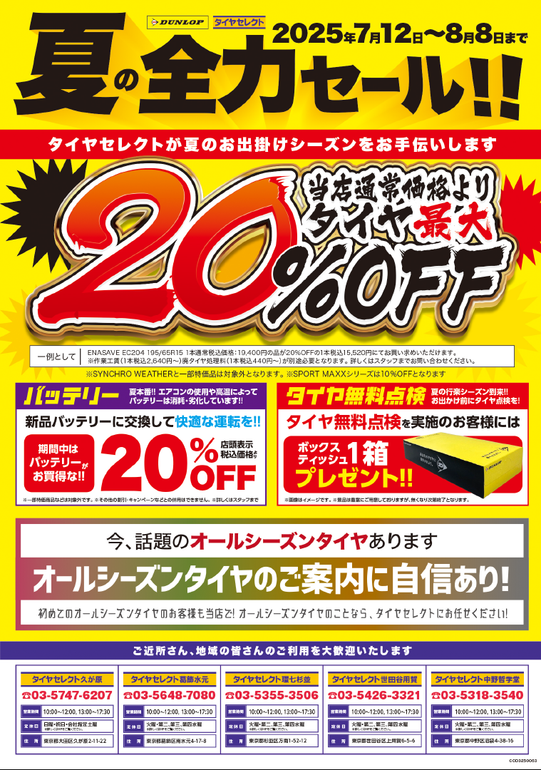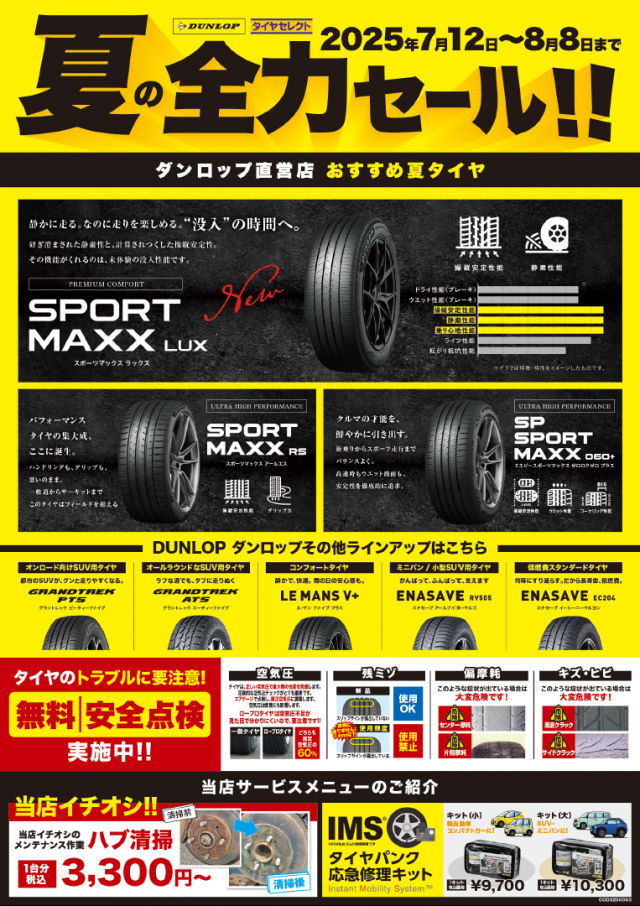 全力セールは8日まで!! 先月から開催されています全力セールですが、今週の金曜日の8日までです。 タイヤがお安く購入できるチャンスですので是非ご利用下さい。 ※店舗に在庫が無いタイヤはメーカー倉庫からのお取り寄せになりますので、少しお時間を 頂きます。 2025.08.04