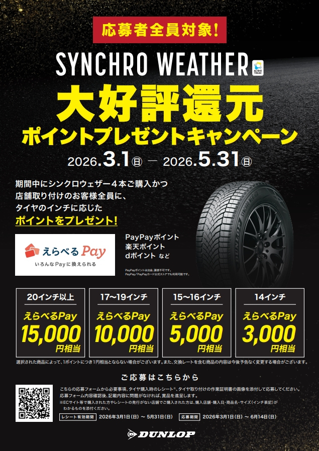 上記の期間内に当店でシンクロウェザーを4本ご購入かつ店舗取り付けのお客様全員に