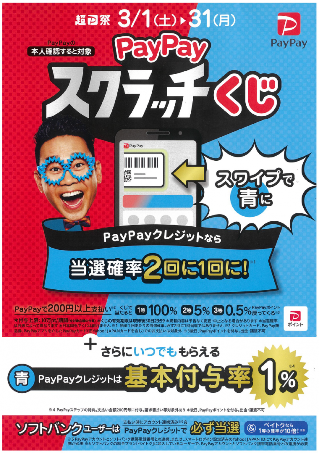 こんにちはタイヤセレクト世田谷用賀です。 PayPayスクラッチくじが開催されます。 開催期間 2025年3月1日~3月31日迄 PayPayで200円以上のお支払いをされますと 抽選に参加出来ます。当選すると決済金額...