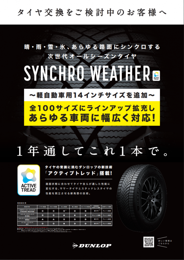 こんにちはタイヤセレクト世田谷用賀です。 以前にもこちらのホームページでお伝えしたのですが、14インチのシンクロウェザーが 12月に発売されます。 155/65R14と165/65/R14の2サイズです。 ...
