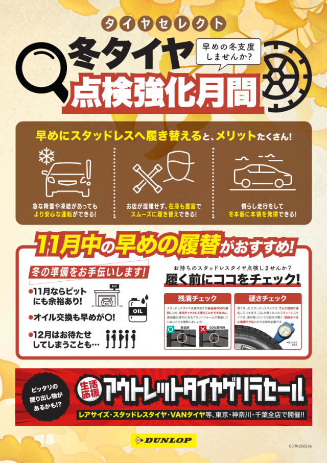 こんにちはタイヤセレクト世田谷です。 本日より11月がスタートし、今年も残すところあと2ヶ月になりました。 徐々に冬タイヤへの履き替え予約のほうが増えてきております。特に11月後半と12月の 予約が埋まっ...