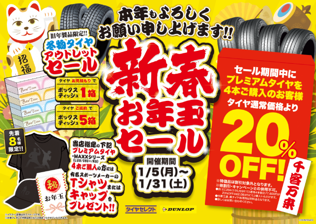 皆様こんにちは。本年もどうぞ宜しくお願いいたします。 タイヤセレクト松戸では本日1月5日(月)より「新春 お年手玉セール」を開催します。ご購入プレゼントなど、 いろいろな特典をご用意し、皆様のご来店をお待...