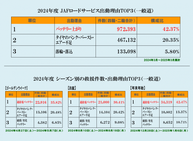 皆様こんにちは。寒い日が続きますね。皆様ご存知ですか、 この時期はバッテリー上がり等のトラブルが多くなること。 下に示すのはJAFさんの出動理由の件数を表にしたもの です。一年を通して見てもシーズン毎で見...