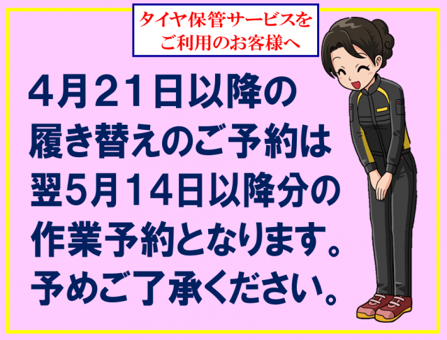 ~タイヤ保管サービスをご利用のお客様へ~ いつも当店をご利用頂きありがとうございます。 さて、タイヤの保管を委託している倉庫会社の GW期間の営業カレンダーに基づき、4月21日 から5月2日の間に頂...