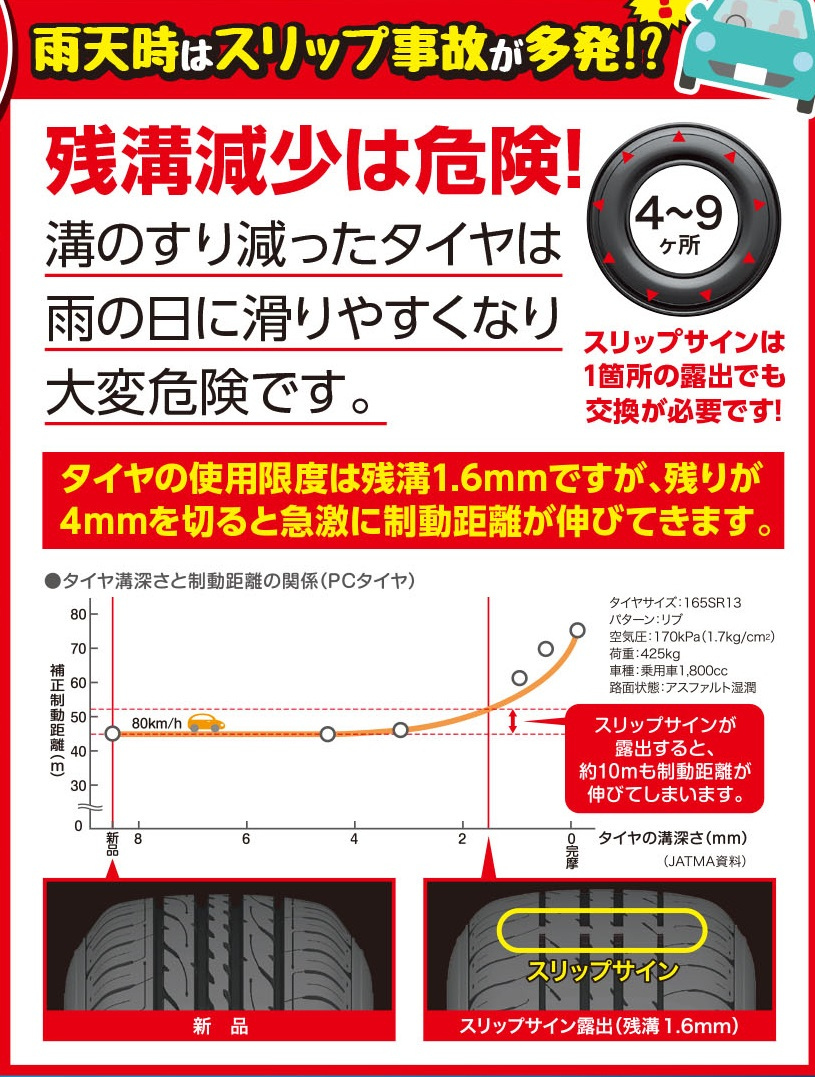 タイヤは残溝が4mmを切る辺りから特に雨の中での
