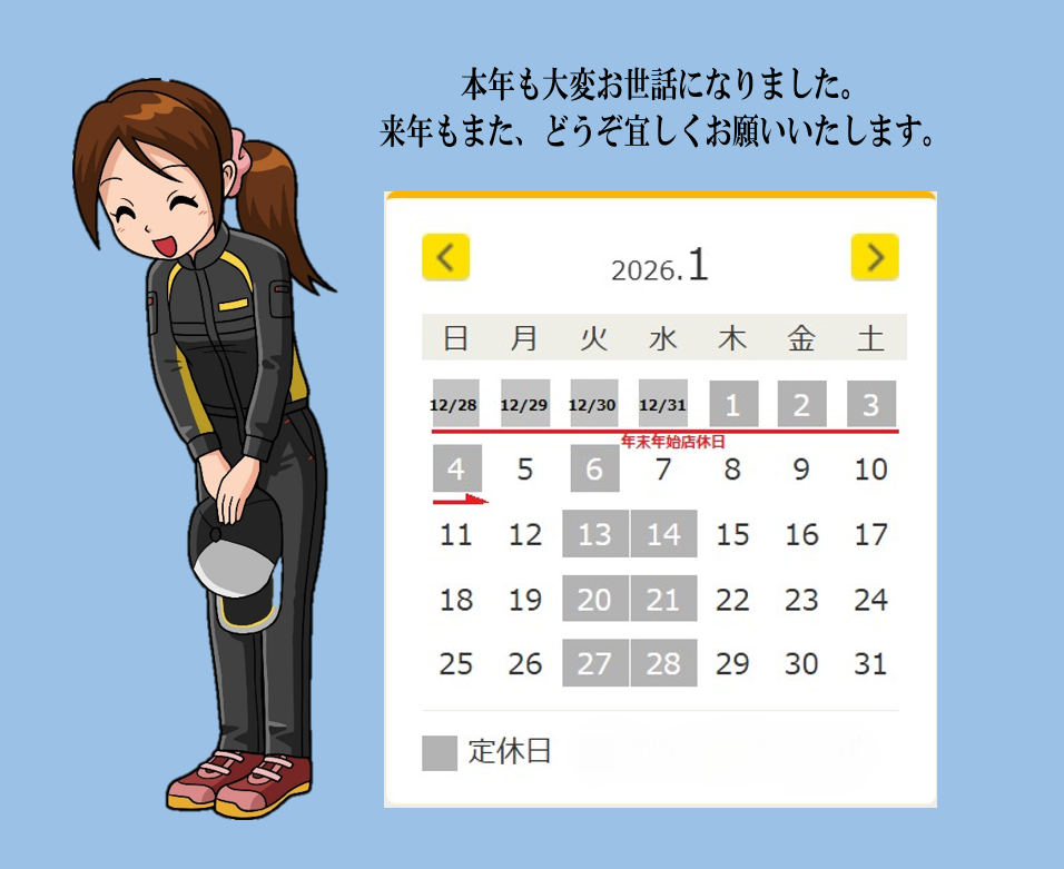 本年も大変お世話になりました 日頃よりタイヤセレクト松戸をご利用頂き、 ありがとうございます。 本年もたいへんお世話になりました。 年明けは5日(月)からの営業開始となります。 来年も変わらぬご愛顧を賜りますようお願い申し上げます。 2025.12.26