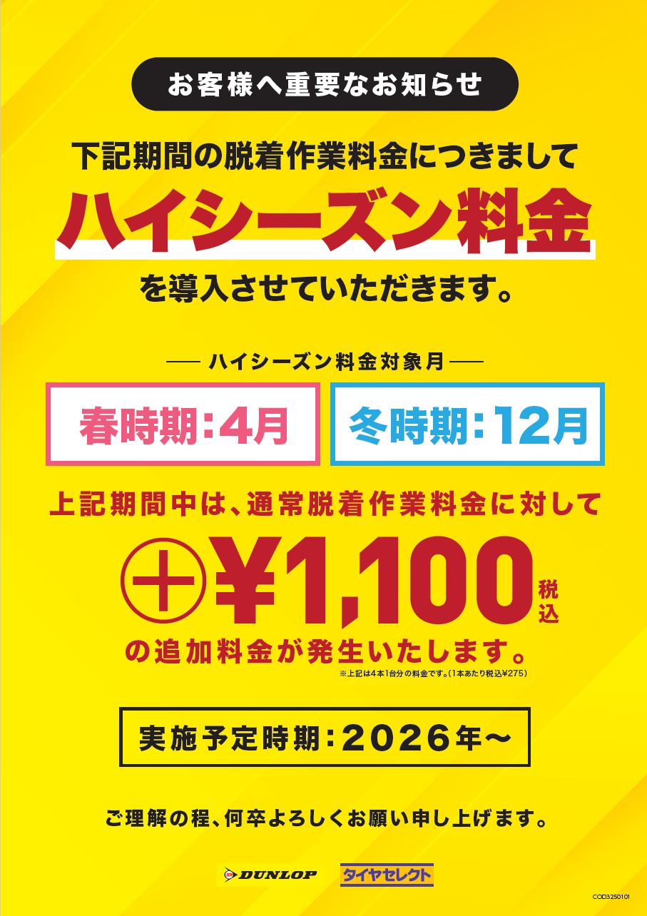 冬の履き替え作業にハイシーズン料金を導入いたします。