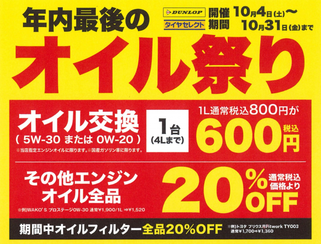 皆様こんにちは。ただいまタイヤセレクト松戸で好評開催中の 「年内最後のオイル祭り」もあと半月で終了となります。当店 指定5W-30または0W-20エンジンオイルが普通自動車4㍑まで 通常税込3,200円→税込2,400円...