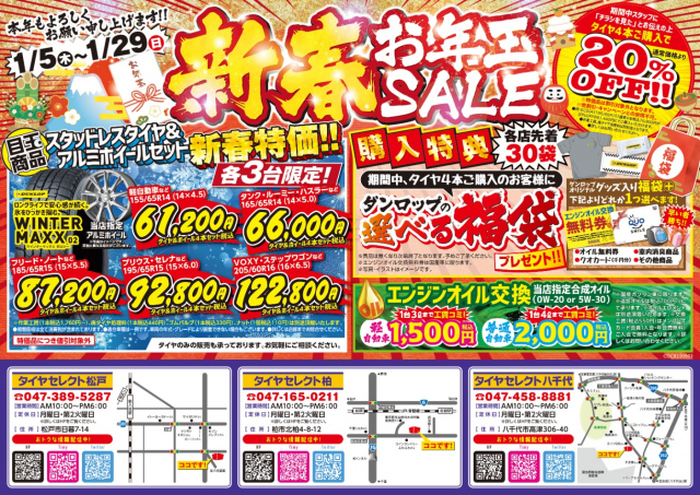 皆様、あけましておめでとうございます。 本年もタイヤセレクト松戸を宜しくお願い致します。 さて、ささやかではありますが、本日5日から29日まで 新春お年玉セールを開催します。 ~タイヤ~ 人気のスタッ...