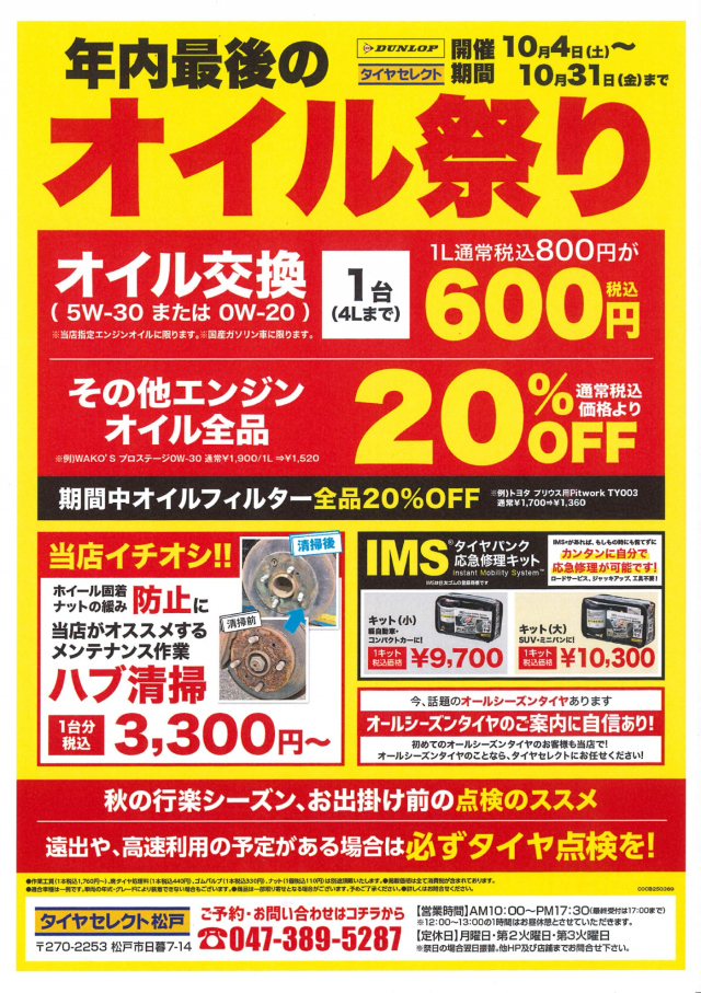皆様こんにちは。タイヤセレクト松戸では 10月4日より「年内最後のオイル祭り」を開催します。 当店指定5W-30または0W-20エンジンオイル 普通自動車通常1台4㍑まで税込3,200円を2,400円で、...
