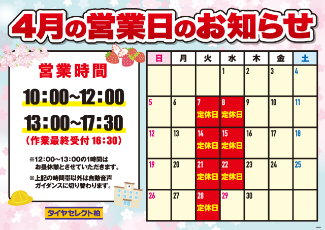 いつもホームページをご利用頂きありがとうございます♪ 3月もたくさんのご来店有難うございました!! 4月の営業日はカレンダー画像の通りとなります。 4月もたくさんのご来店をお待ちしております♬