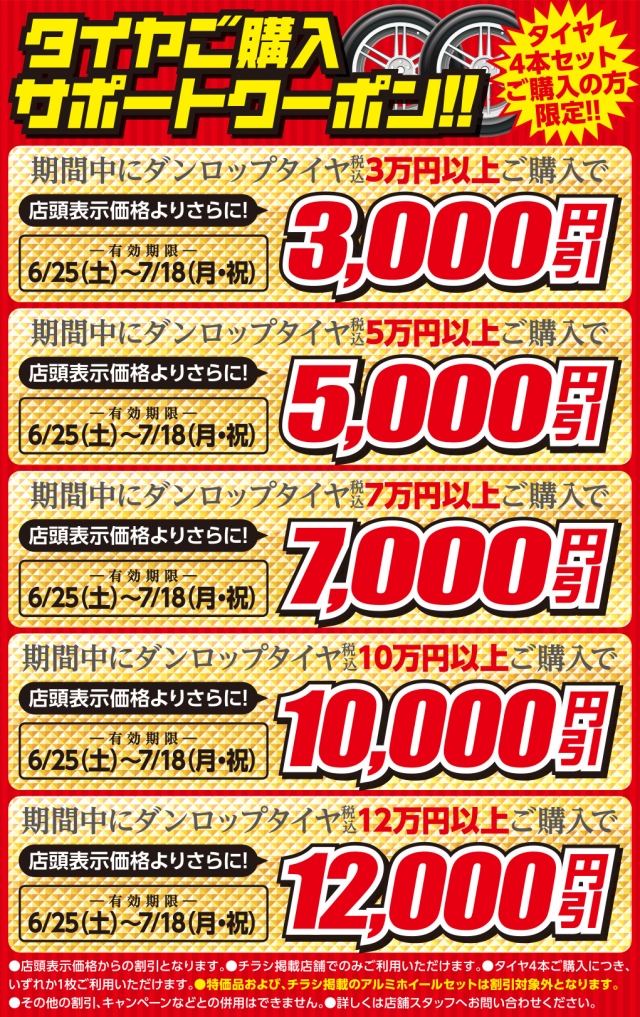 6/25(土)より7/18(月祝)までの期間、ダンロップの直営店統一夏の全力セールが始まります!