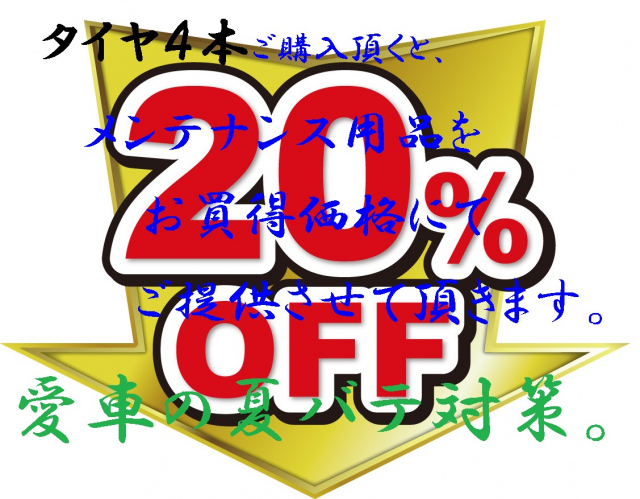 という事で、今月タイヤを4本お買い上げ頂くとオイル、バッテリー、ワイパー、エアコンフィルターなどなど、店頭価格からさらに20%OFFにてご提供させて頂きます。