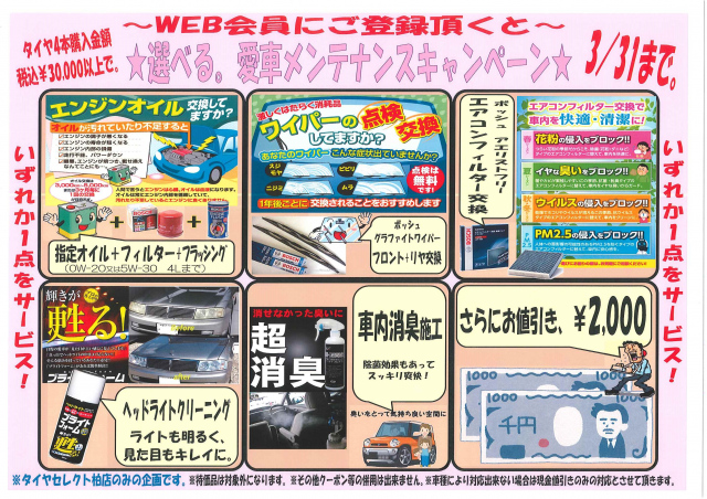 タイヤ4本の購入金額が税込¥30,000円以上の場合にご希望のメンテ特典を1つ無料でお付けいたしますよ!!!奮発しましたよ~!!!!