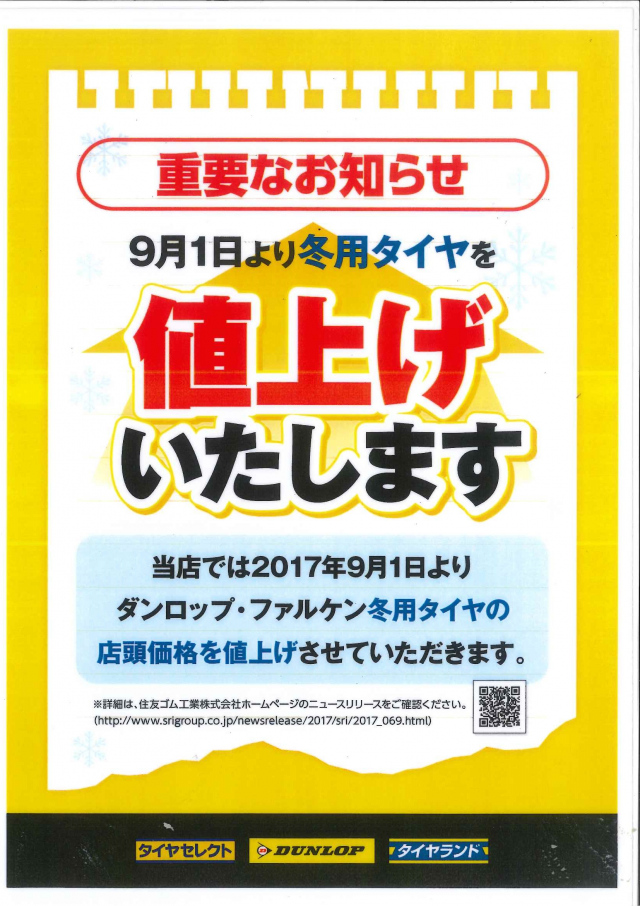来たる9月1日より、スタッドレスタイヤの価格が値上げされます!