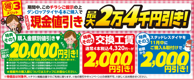 ☆下記のタイヤ4本ご購入で、ド~ンと、現金値引き!!