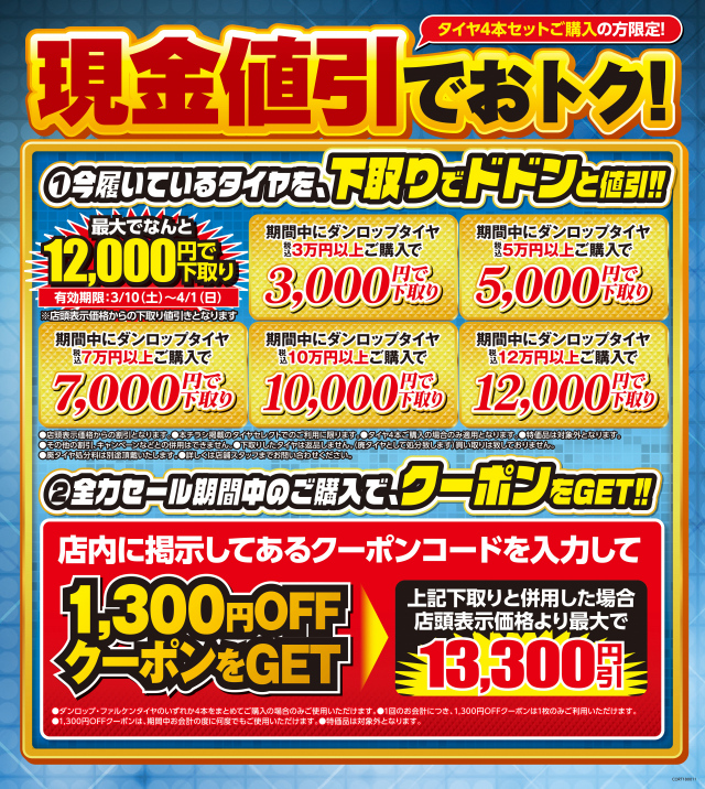 ①今回、限定品、特価品を除くタイヤ4本ご購入で・・・・
