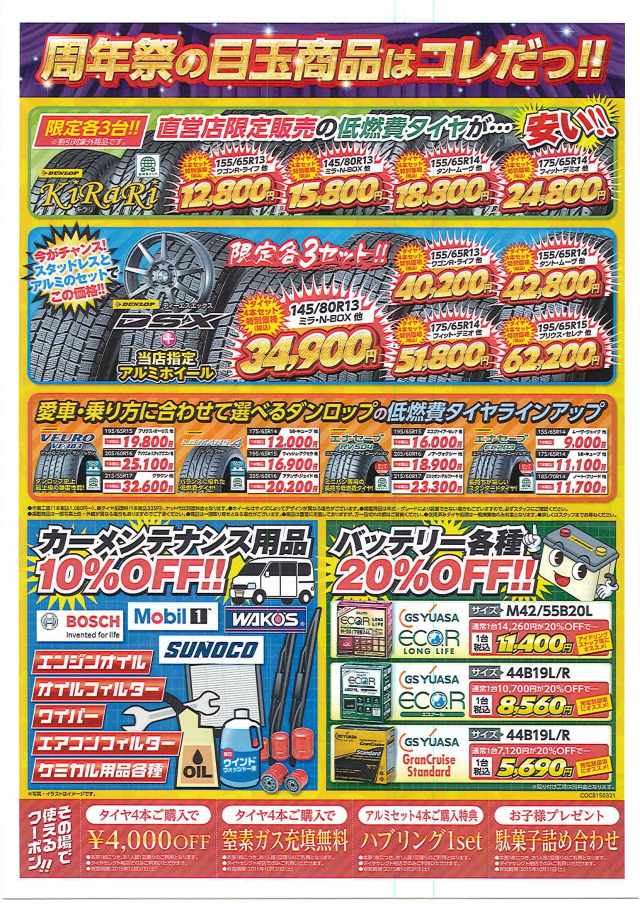 夏タイヤ・冬タイヤはモチロンの事、オイル・ワイパー・エアコンフィルター等のメンテナンス品全てを割引価格にてご提供いたします。