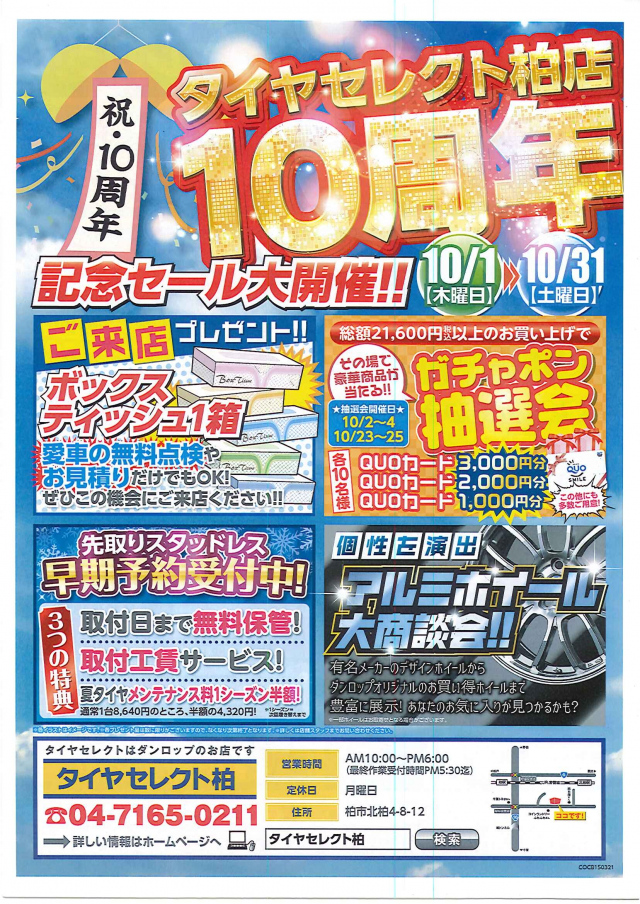 今日から10月スタートです。そしてタイヤセレクト柏店もはれて10年目を迎えることが出来ました!有難うございます。
