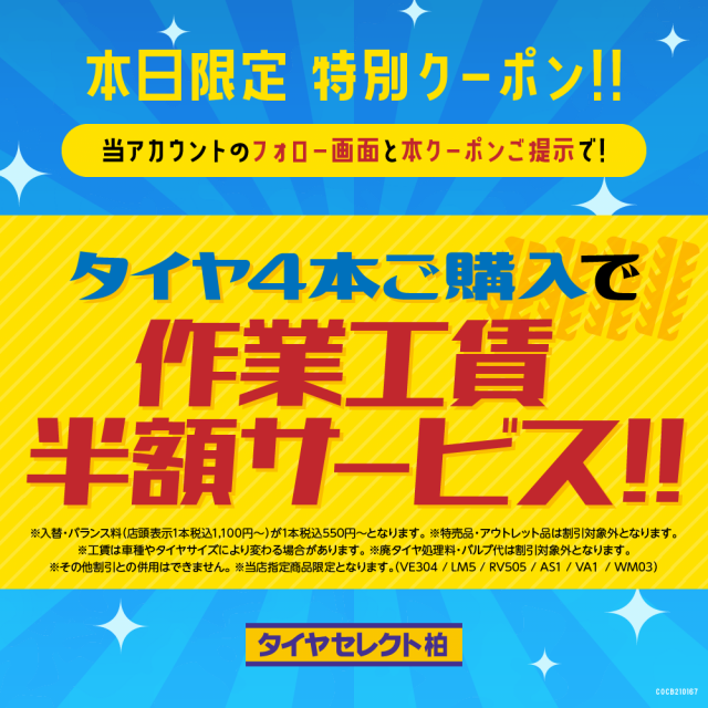 ②ゲリラクーポン:タイヤ4本ご購入で作業工賃半額。
