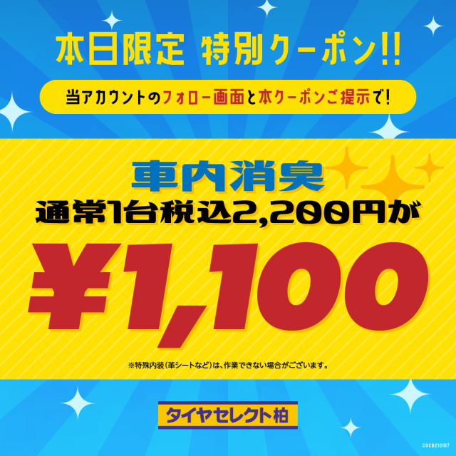 ・ゲリラクーポン:タイヤ4本ご購入で作業工賃半額。