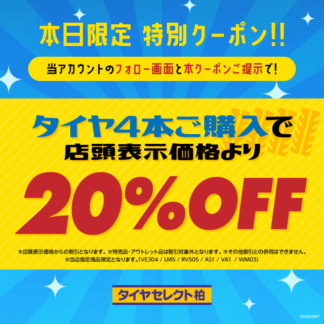 ・ゲリラクーポン:タイヤ4本ご購入で店頭表示から20%OFF。