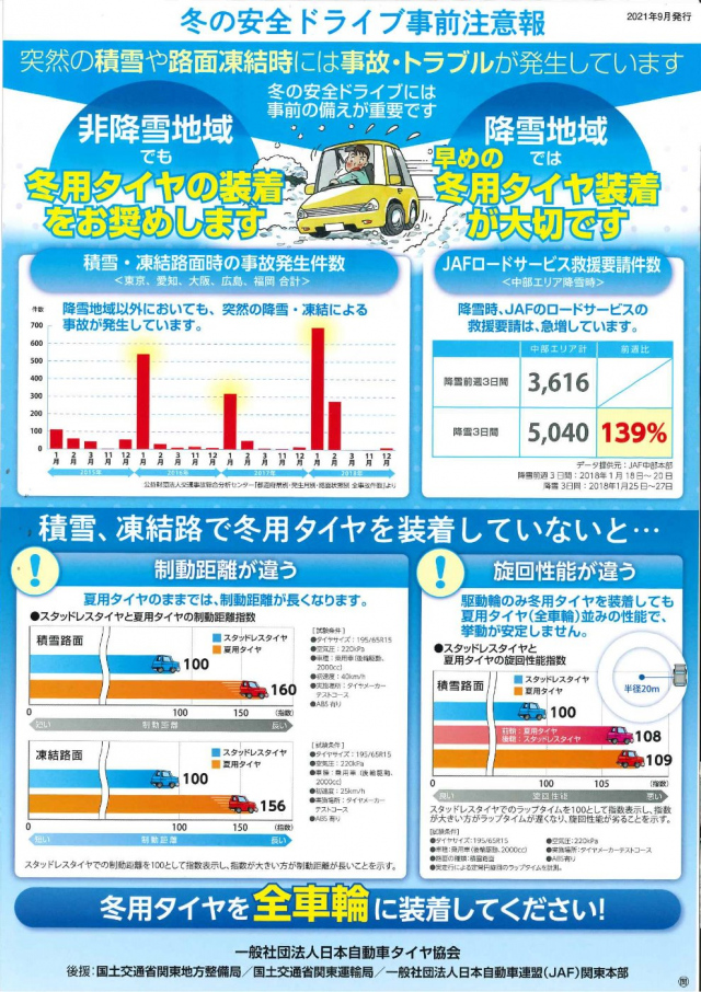 雪が降りだすと、夏タイヤでの走行は大変危険です。
