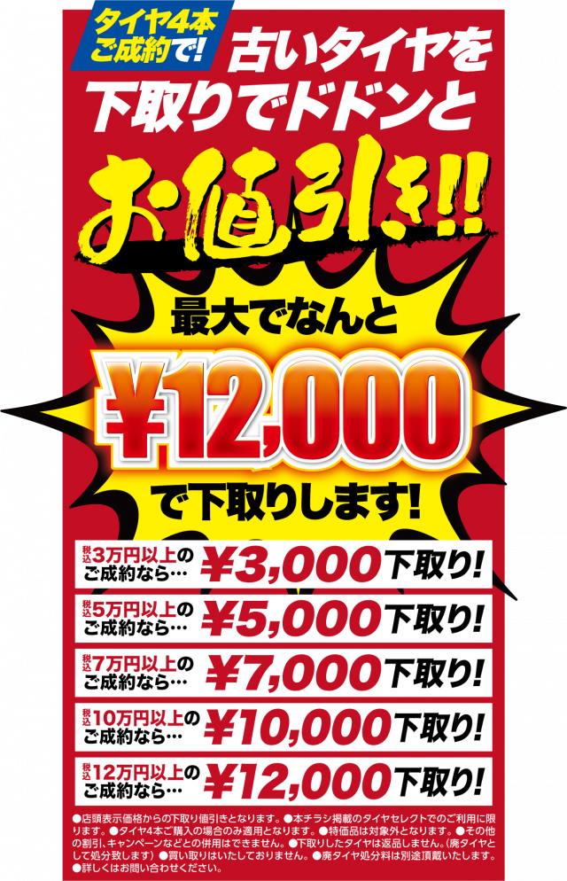 タイヤ4本ご購入で、古いタイヤを下取りドドンとお値引き!