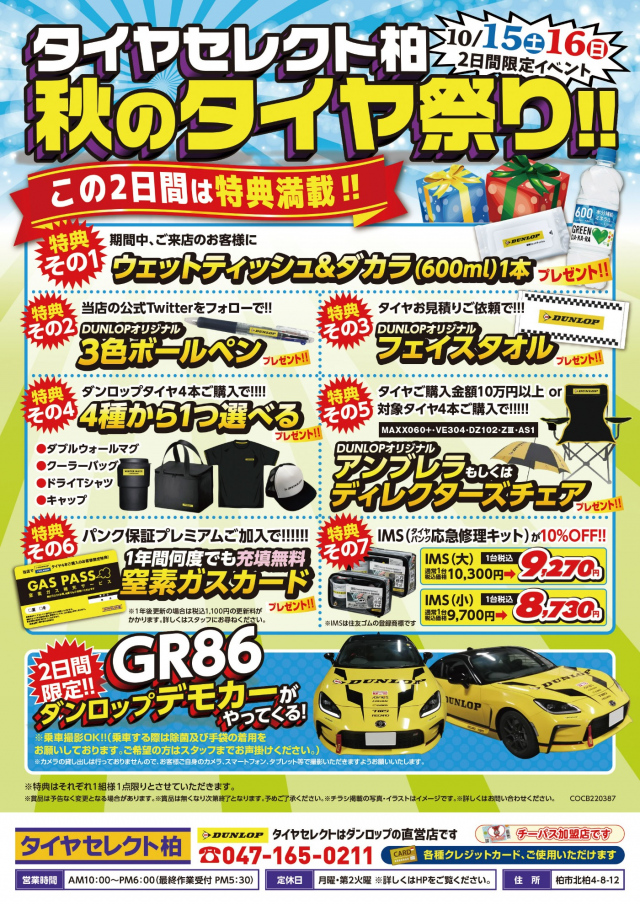 2日間は、秋のタイヤ祭り開催で特典モリ盛り沢山!