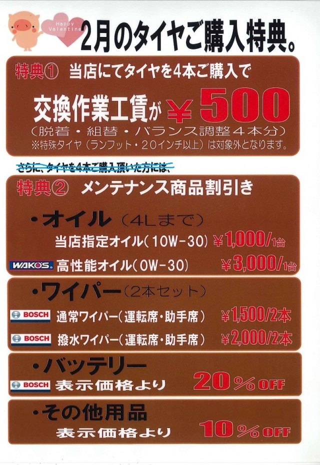 例えば、オイル交換¥1,000ポッキリとか。ワイパー2本で¥1,500とか。