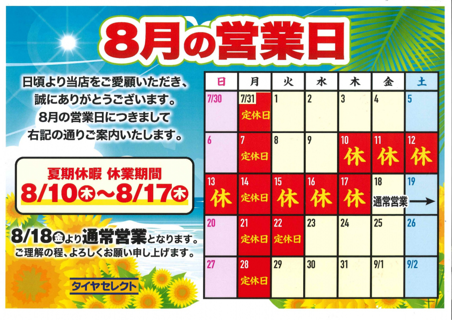 8/18日より通常営業いたしますのでまたよろしくお願いいたします。