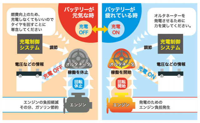 充電制御機構・・・バッテリーの充電量を計測し必要以上の発電をせずエンジンへの負荷を低減させることで燃費向上を狙った機構に対応しています。