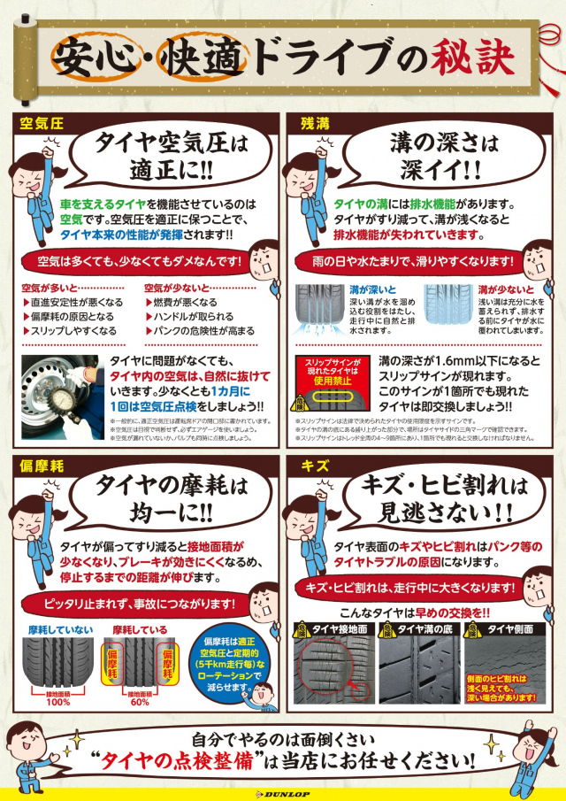 空気圧点検と一緒にタイヤ点検もさせて頂きます。