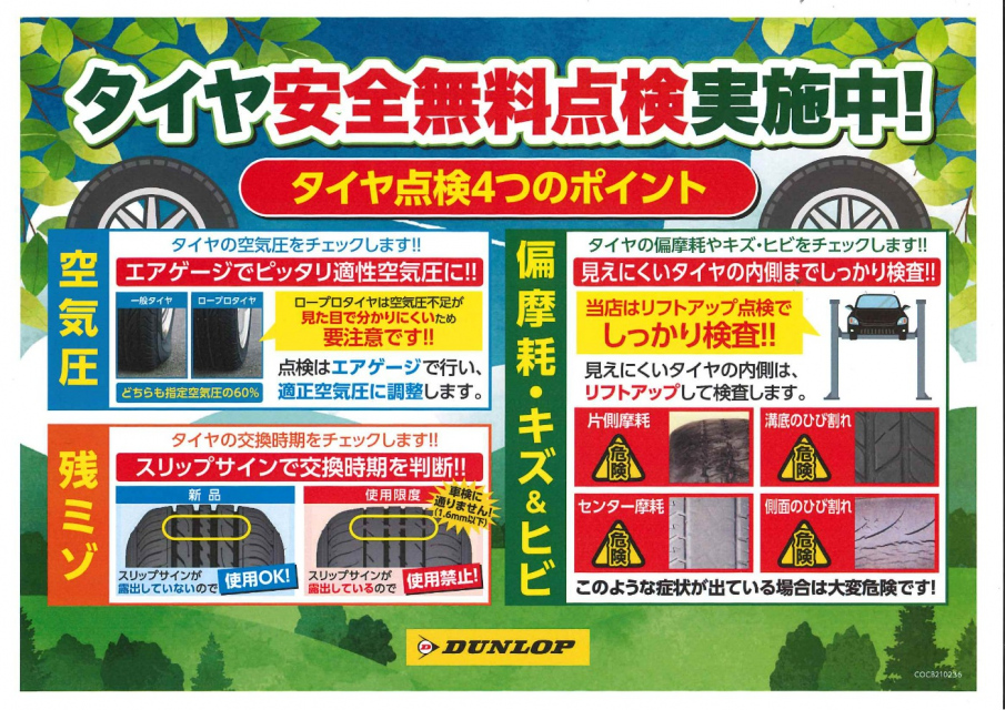 タイヤの空気圧点検と一緒にタイヤ点検をオススメします!
