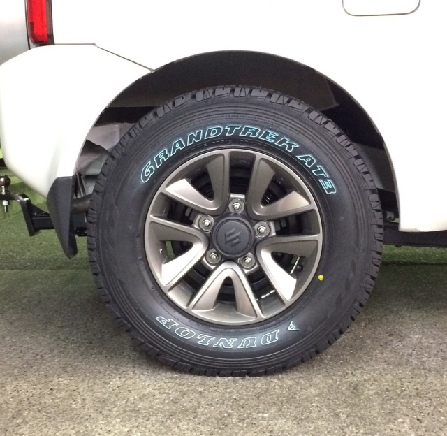 タイヤサイズを変更し、ホワイトレタータイヤになりました。本来の目的は外径を大きくして今後少しだけリフトアップをする予定です。