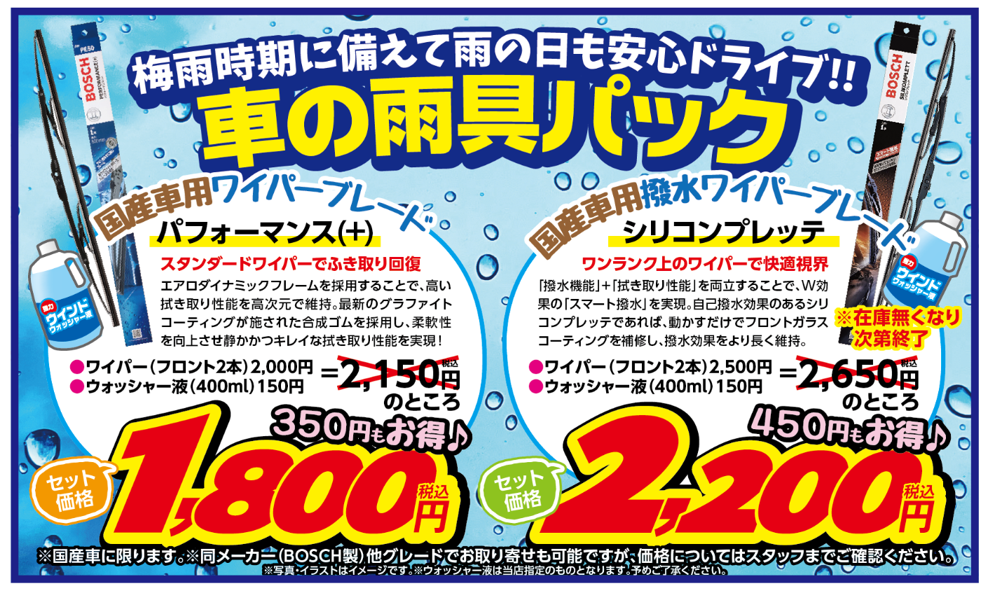 5月は車の雨具パック(ワイパー+ウォッシャー液)がお得です!