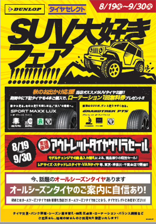 「SPORT MAXX LUX」か「GRNDTREK PT5」を4本ご購入でローテーション1回無料券をプレゼント!!