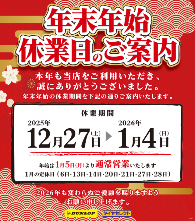 ☆年末年始営業日案内 いつもホームページをご利用いただきありがとうございます♬ 本日年内最終営業日となります。 明日12/27~1/4まで店休となります。 ご迷惑とご不便をおかけいたしますがご理解賜りますよう よろしくお願い申し上げます。 2025.12.26