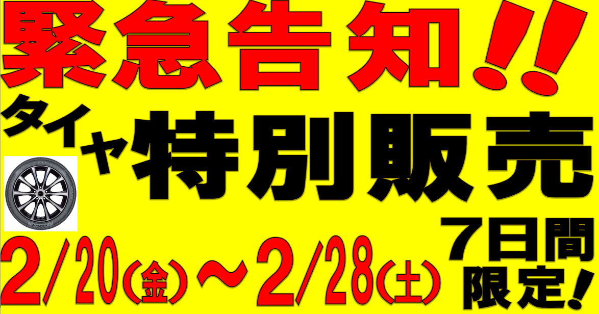 ☆【緊急告知】タイヤ特別販売開催中!!! いつもホームページをご利用頂きありがとうございます♪ タイヤ特別販売開催中!!! 期間:2/20(金)~2/28(土) 7日間限定で開催中です! この機会を是非ご利用ください♬ 2026.02.20