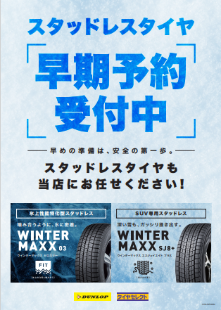 いつもホームページをご利用いただき有難うございます♪ 冬タイヤのご予約受付中です! 商品によってはお取り寄せに時間がかかる場合もございますので、ご予約はお早めにお願いします! 今、お持ちのスタッドレスの点検...