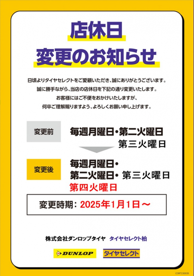いつもホームページをご利用いただきありがとうございます。 来年より店休日が変更となります。 今まで 毎週月曜日・第二火曜日・第三火曜日 でしたが 来年より 毎週月曜日・第二火曜日・第三火曜日・第四火曜日 とな...