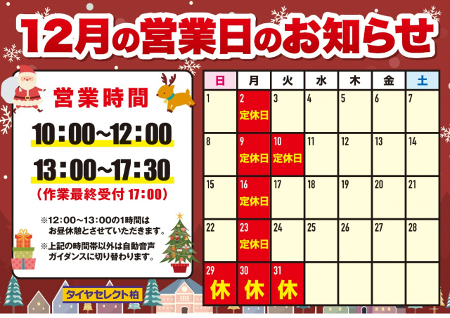 いつもホームページをご利用いただきありがとうございます♬ 11月もたくさんのお客様にご利用いただきましてありがとうございます。 12月の営業日のご案内です。 12月の営業日は上記画像の通りです。 1...