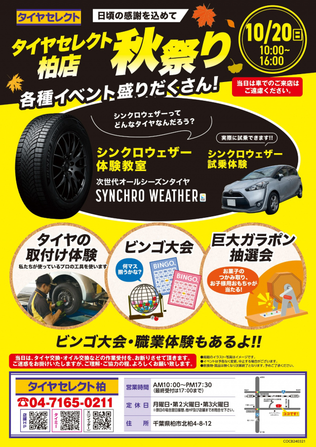 皆様こんにちは! 昨年に続き・・今年も・・! 日頃より当店をご愛顧いただいている 地域の皆様への感謝の気持ちを込めて 10月20日(日)午前10時より、 タイヤセレクト柏 秋祭りを開催致します! ヨソとは一味...