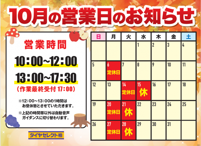 いつもホームページをご利用いただき有難うございます♪ 10月の営業日はカレンダー画像の通りとなります。 10月6日(月)は店休日となります。 お客様にはご不便をお掛け致しますがご理解賜りますようお願い申し上げます...
